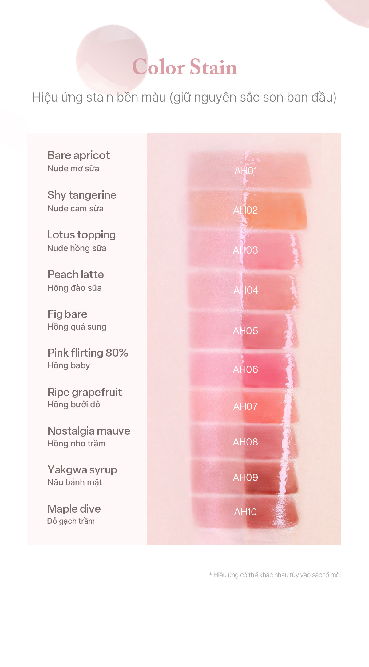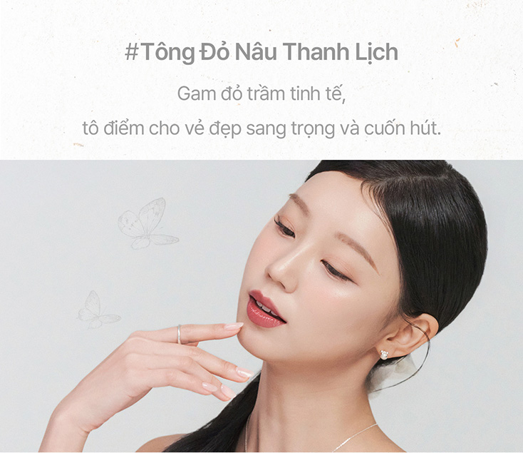 Mute Color: Bảng màu trầm tinh tế, dẫn đầu xu hướng. Điểm cộng tuyệt đối từ lớp Color Stain bám màu chuẩn xác, giữ môi tươi tắn tự nhiên ngay cả sau khi ăn uống.