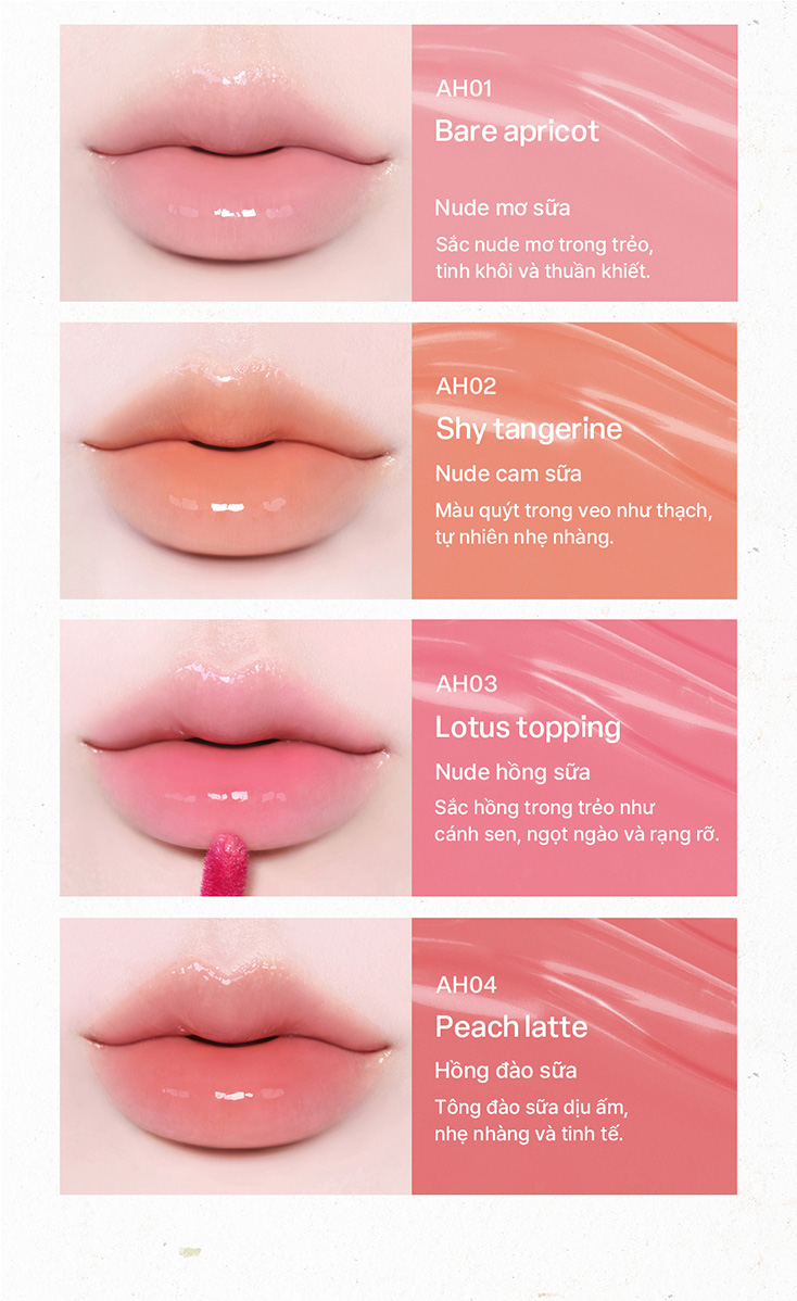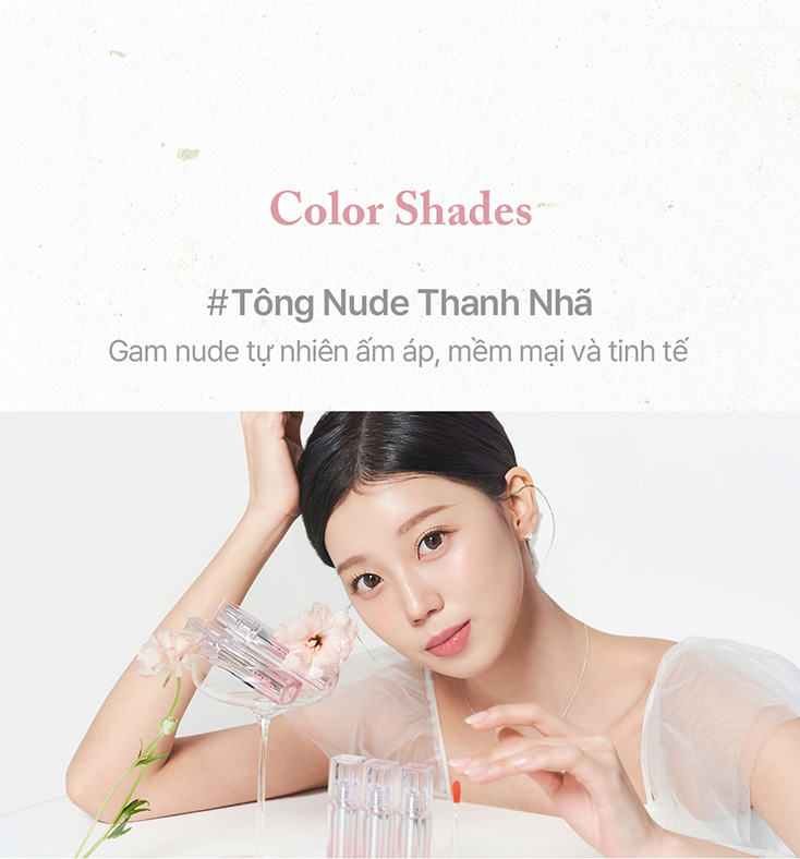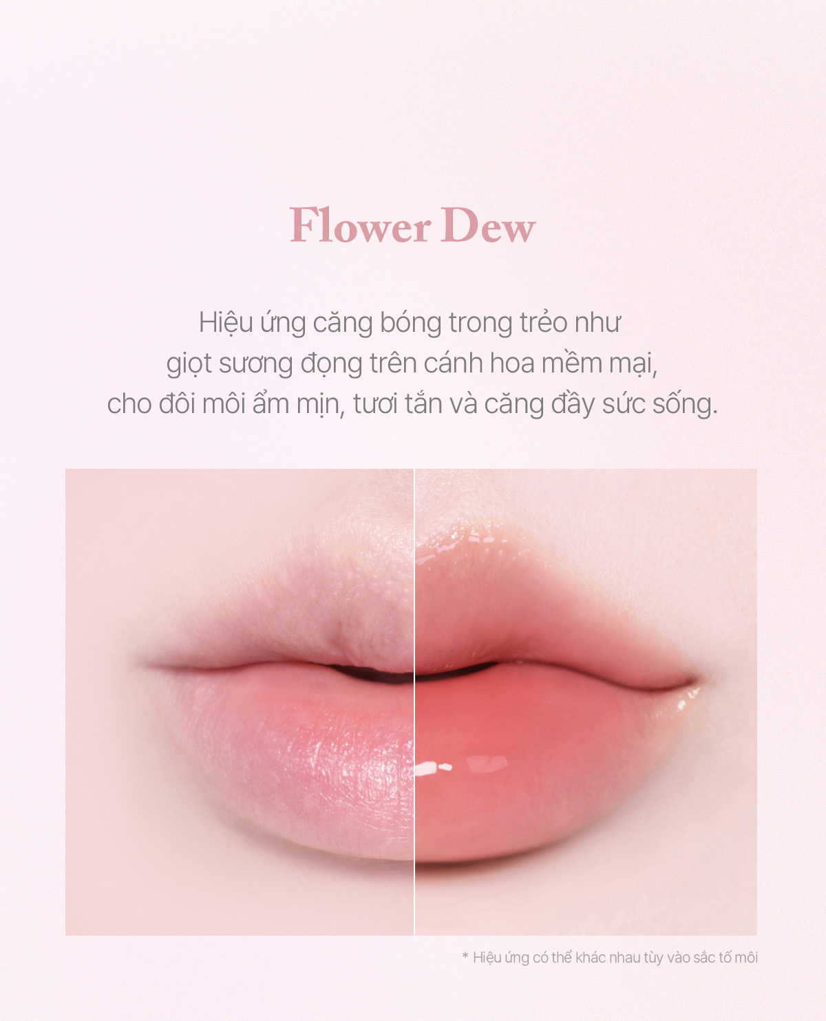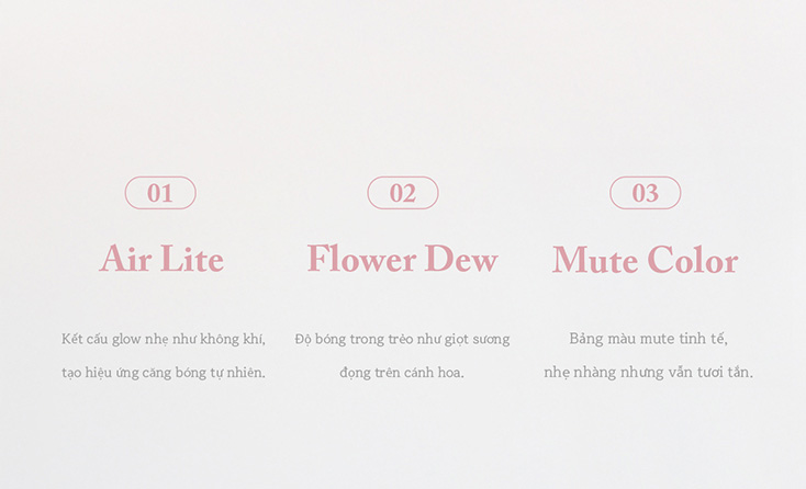 Flower Dew: Hiệu ứng môi "ngậm nước" trong trẻo như giọt sương mai đọng trên cánh hoa, giúp đôi môi luôn tươi tắn và căng đầy sức sống.