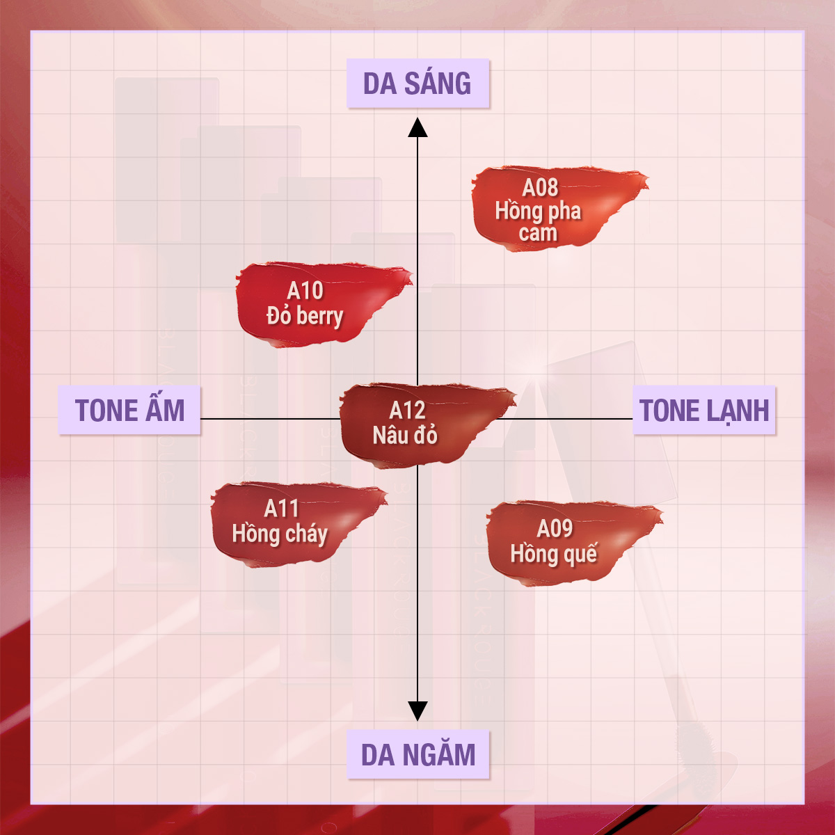 - Bảng màu son Black Rouge A12 có khả năng lên màu chính xác gần 90%, tạo nên sắc son tuyệt đẹp và nổi bật trên môi. Tuy nhiên, đối với những đôi môi bị khô hay nứt nẻ thì màu son có thể sẽ không lên chuẩn và đều màu.