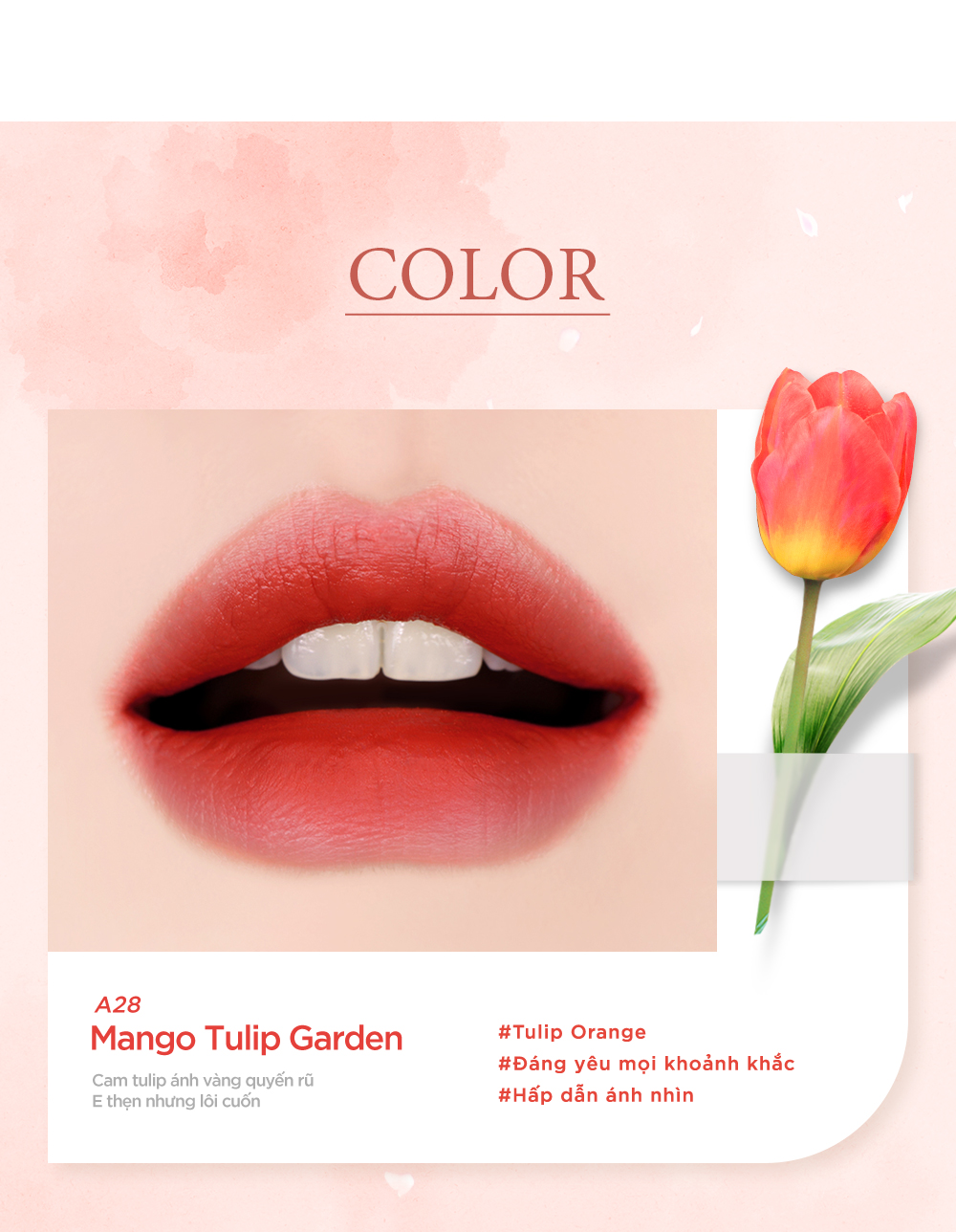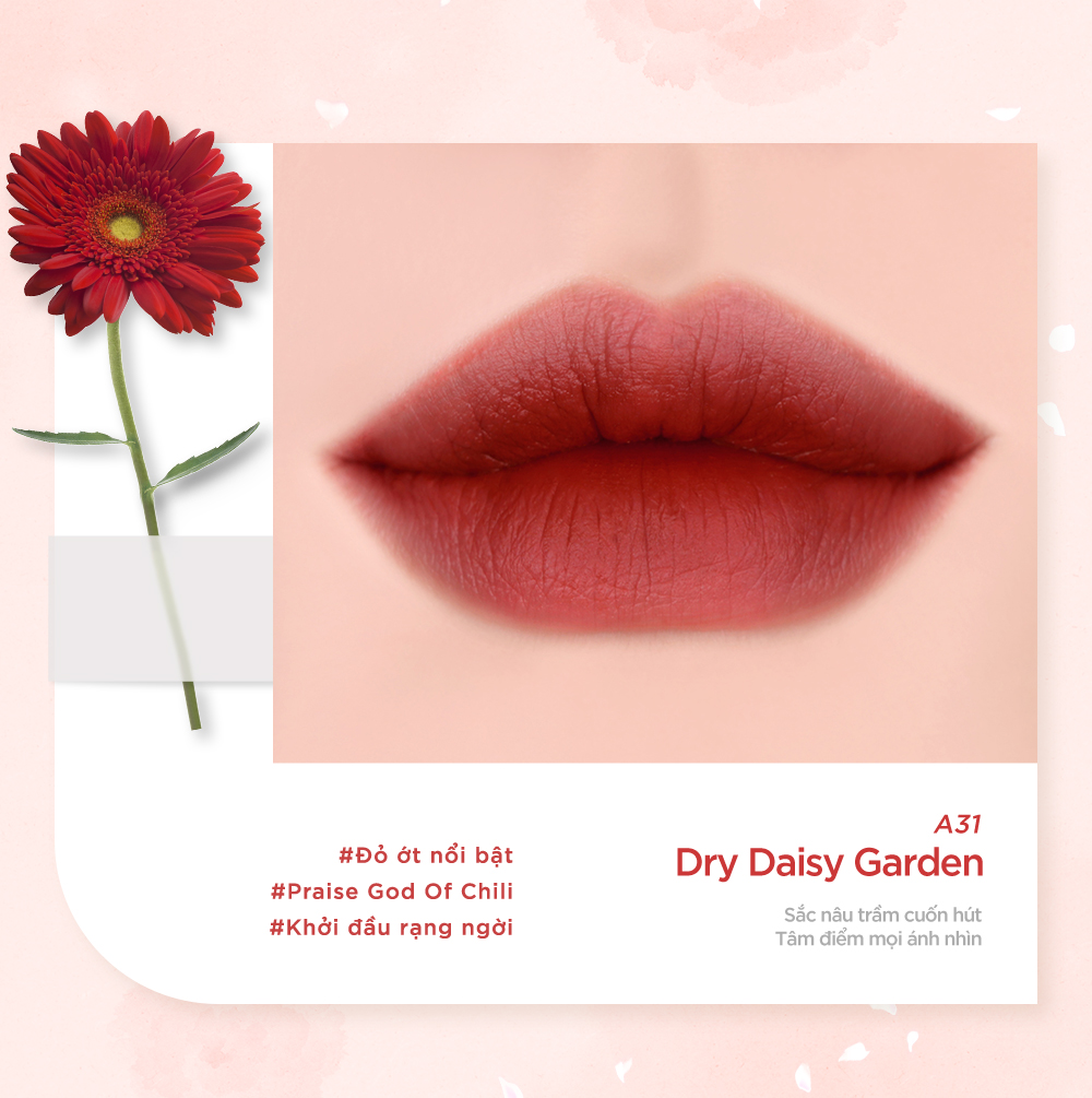 • Kết cấu velvet mịn màng, lên màu chuẩn, nhẹ môi, tạo hiệu ứng semi-matte.