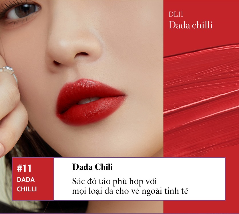 - DL11 - Dada Chilli: Sắc đỏ táo phù hợp với mọi loại da với sắc đỏ thuần khiết đến 99,9%