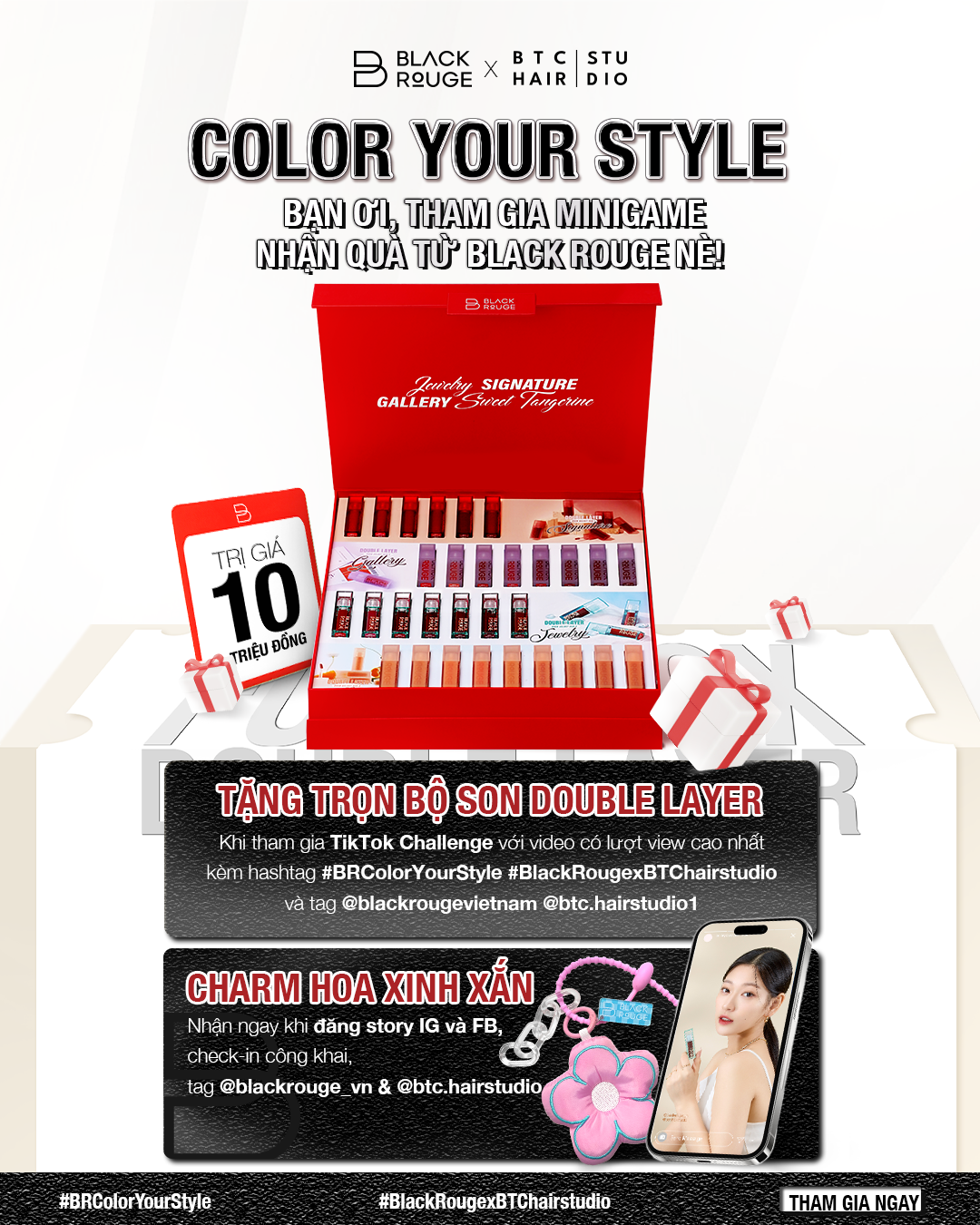 Tháng 12 đã đến, cơ hội hoàn hảo để glow-up bản thân, đổi màu, kiểu cho mái tóc và dôi môi cũng lên màu rực rỡ cho mùa lễ hội cuối năm. Để nàng có thêm động lực tỏa sáng, Black Rouge cùng Behind The Chair Hair Studio mang đến chương trình "𝐂𝐎𝐋𝐎𝐑 𝐘𝐎𝐔𝐑 𝐒𝐓𝐘𝐋𝐄" với phần quà lớn nhất là trị giá 10 triệu đồng!