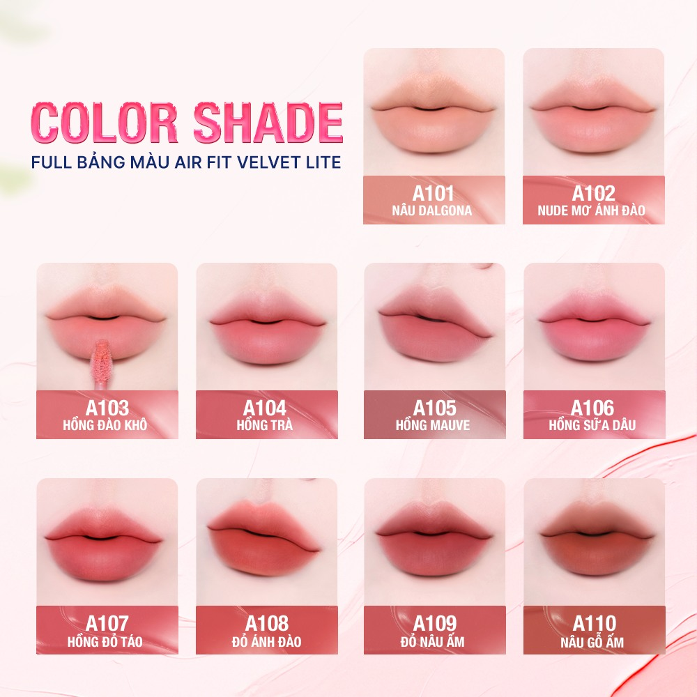 Kết cấu Air Lite: Đây là "linh hồn" của dòng Air Fit Velvet Lite. Chất son kem đặc nhưng khi tán lại mỏng nhẹ như không khí, giúp che phủ sắc tố môi và xử lý thâm viền môi cực tốt mà không gây cảm giác dày nặng.