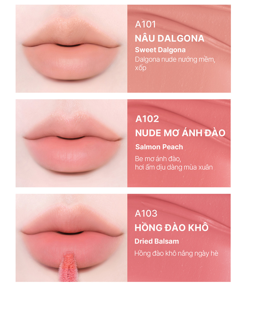 A102 - Nude be ánh đào: Mang lại nét tươi tắn nhẹ nhàng, cực kỳ hợp làm nền cho màu son A109 - Đỏ nâu ấm (Best-seller của Air Fit Ver 10).