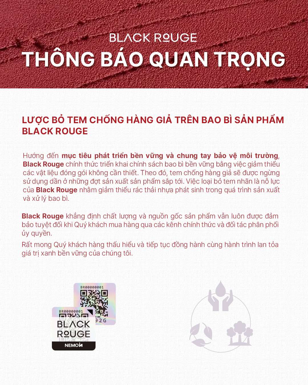 Hướng đến mục tiêu phát triển bền vững và chung tay bảo vệ môi trường, Black Rouge chính thức triển khai chính sách bao bì bền vững bằng việc giảm thiểu các vật liệu đóng gói không cần thiết. Theo đó, tem chống hàng giả sẽ được ngừng sử dụng dần ở những đợt sản xuất sản phẩm sắp tới. Việc loại bỏ tem nhãn là nỗ lực của Black Rouge nhằm giảm thiểu rác thải nhựa phát sinh trong quá trình sản xuất và xử lý bao bì.